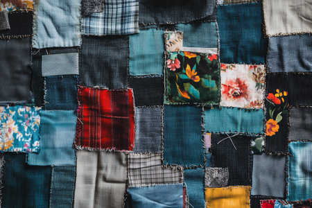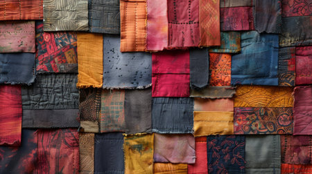 patchwork textile art, a patchwork print design features quilted fabric patches of various shapes and sizes, providing a visually stunning and eclectic appearance