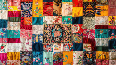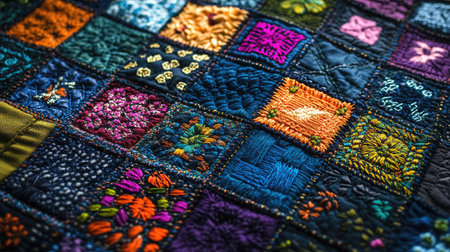 Explore the beauty of a colorful quilt patchwork showcasing intricate embroidery designs. This textile art piece captures the warmth and creativity of handmade crafts.