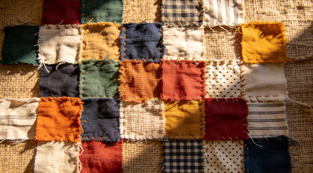 colorful quilt patchwork, colorful fabric patches create a delightful quilt pattern on the table, showcasing a lively and vibrant design
