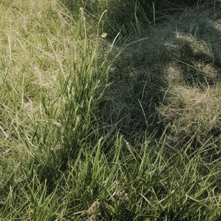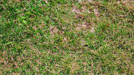 Dry, dead patches showing on an unhealthy green lawn during a drought, needing water and care