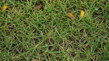 Green showing close up view of a lawn with green grass and some dry yellow blades with fallen leaves and water...