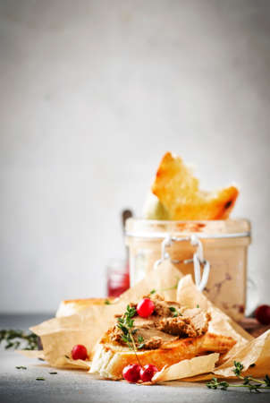 Delicious pate of chicken liver and meat on grilled toasts with cranberries and thyme, gray kitchen table background, space for text, selective focus