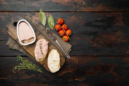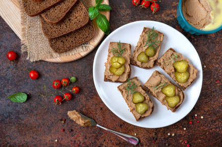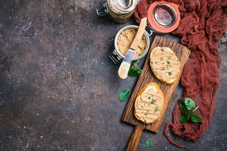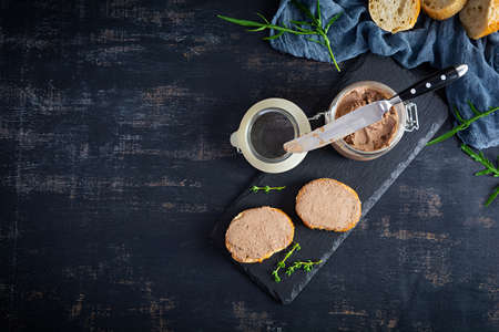 Liver pate on toast set, on old dark rustic table background, top view flat lay, with copy space for text