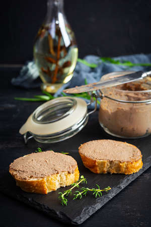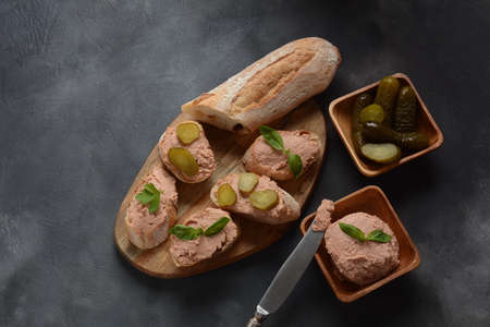 Food concept Chicken Liver spread Pate Baguette bite on wooden board on black background with copy space