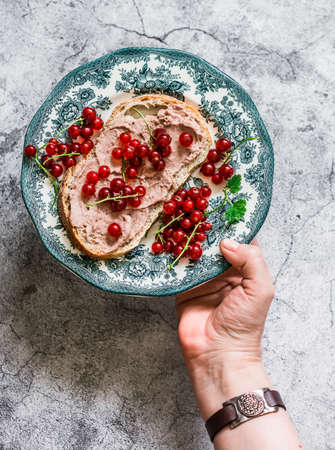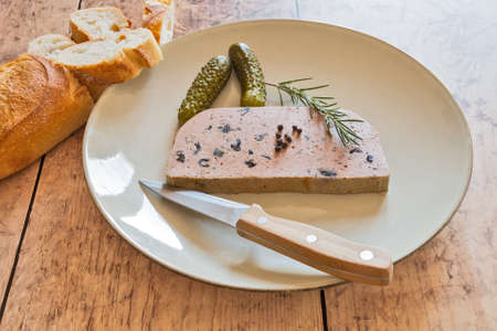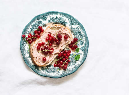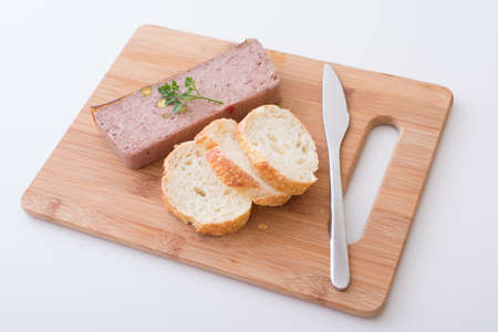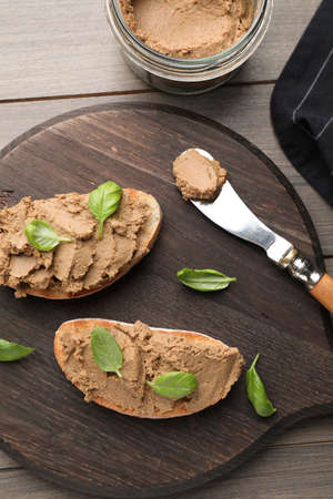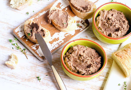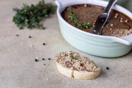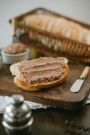 Healthy food, delicious beef liver pate on a baguette with a crispy crust on a light table.