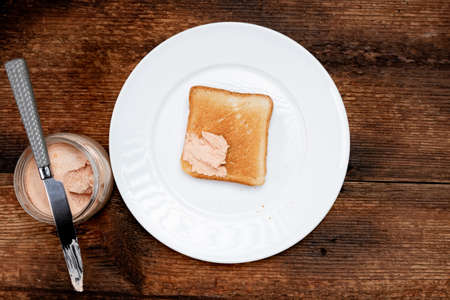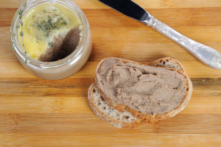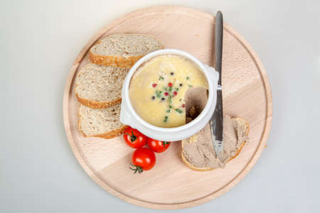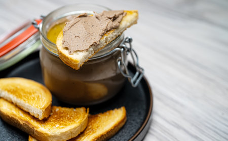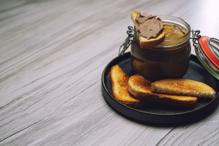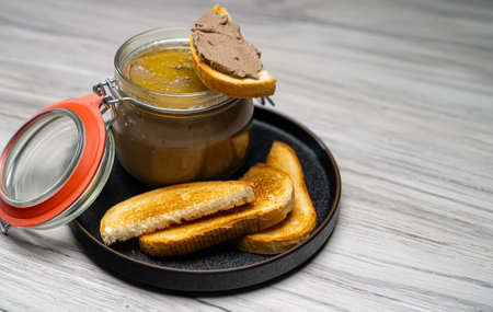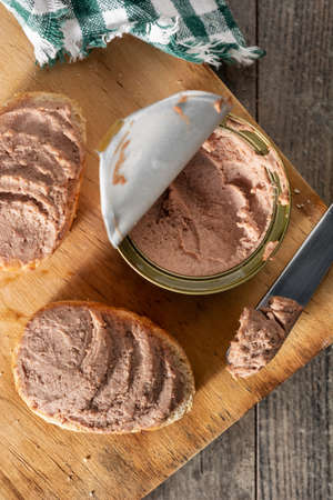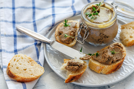 jar of foie gras and French baguette wedges. Preparing canapes.