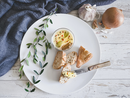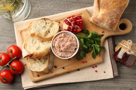 Chicken liver pate with butter. Crunchy baguette with flax and poppy seeds, fresh parsley. Concept of traditional french food. Vintage wooden board, linen napkin, on stone background