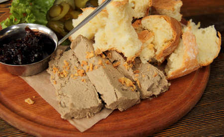 Homemade pate and bread with cranberries and raisins on a wooden board. Table setting, cafe, restaurant, menu