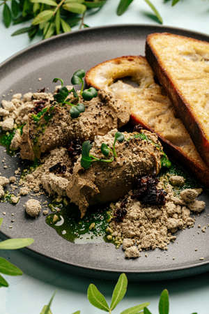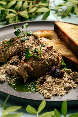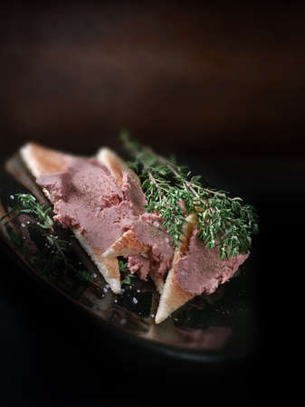 Duck paste with ice cream and grilled white bread croutons. Close-up, low key, gray background.