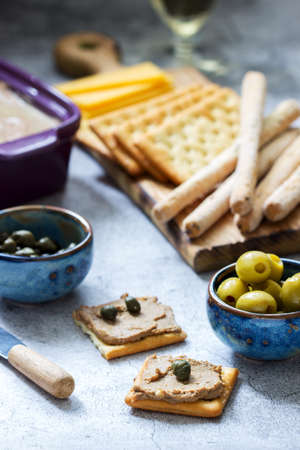 Delicious pate from duck liver with pieces of white bread on a wooden board. Gourmet appetizers, Assorted Italian appetizer bruschetta.