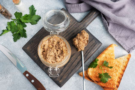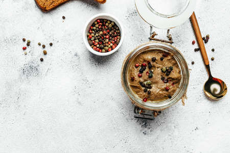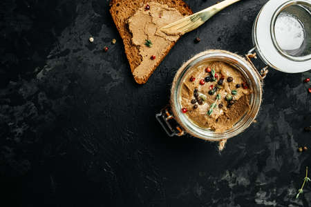 Fresh homemade chicken liver pate in a glass jar. banner, menu, recipe place for text, top view.