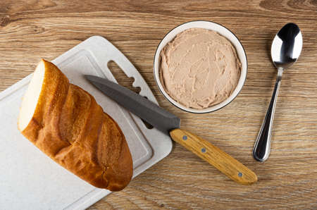 Piece of wheat bread, kitchen knife on plastic cutting board, meat pate in white bowl, teaspoon on wooden table. Top view