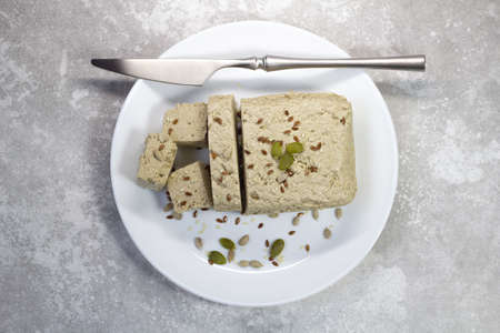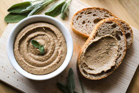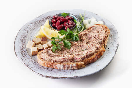 From above of appetizing toast with homemade vegetarian liverwurst pate served on plate with bowl of red beans cubed cheese and lemon on white background