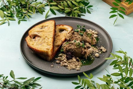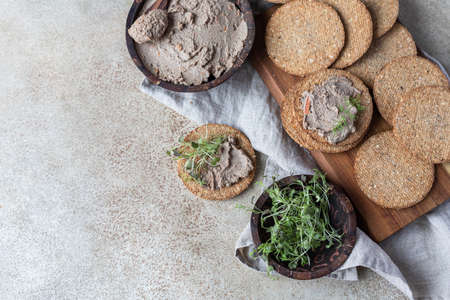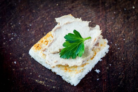 Meat liver pate on toasted bread with fruit seeds and spice herb, brown kitchen table, copy space, selective focus