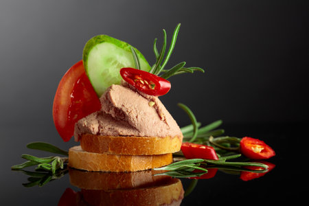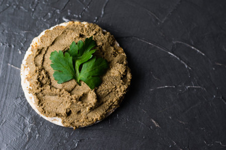Healthy food, delicious sandwich made of diet rice bread and delicious beef liver pate, decorated with a parsley leaf, close-up on a dark background