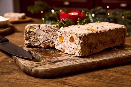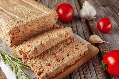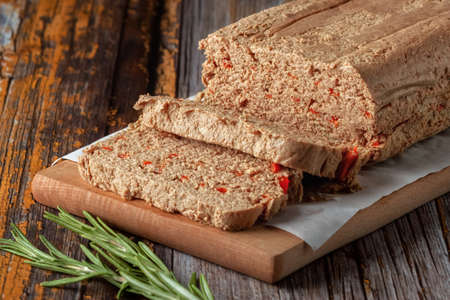 Chicken terrine with vegetables and herbs on a wooden cutting board