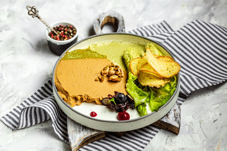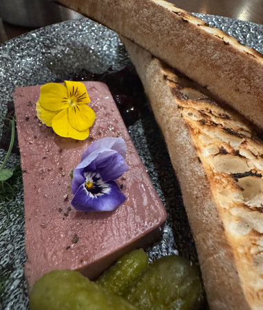 Belgian duck liver with champagne jelly, basil, butter, bread and pistachios on wooden board in domestic kitchen