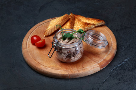 Homemade turkey or chicken liver pate in a glass jar. Baguette slices. Cherry tomatoes on a wooden round board.