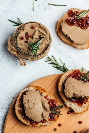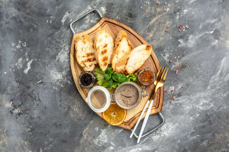 Homemade duck liver pate with red onion jam. Gourmet appetizers, Assorted Italian appetizer bruschetta. banner, menu, recipe place for text, top view.