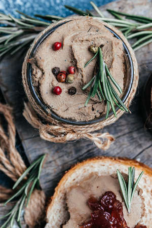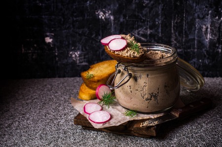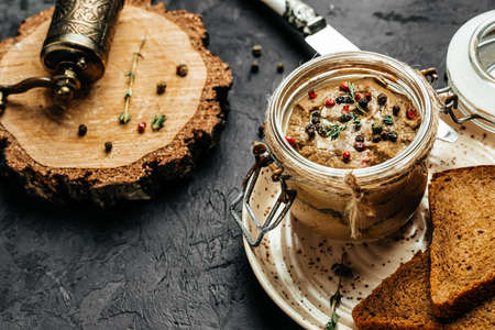 liver pate. homemade chicken liver pate in a glass jar. haute cuisine. Restaurant menu, dieting, cookbook recipe.