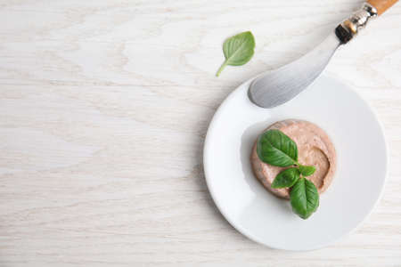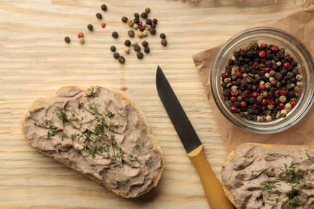 Fresh homemade chicken liver pate with herbs for bread on a natural wooden table. A sandwich. top view