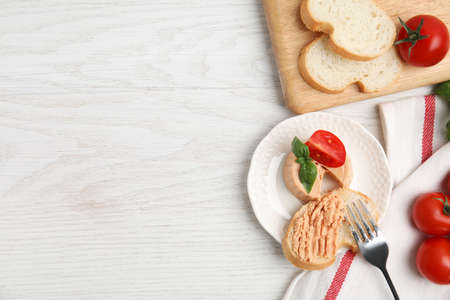Delicious liver pate, bread and tomatoes on white wooden table, top view. Space for text