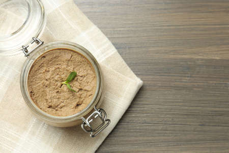 Glass jar with delicious liver pate on wooden table, top view. Space for text
