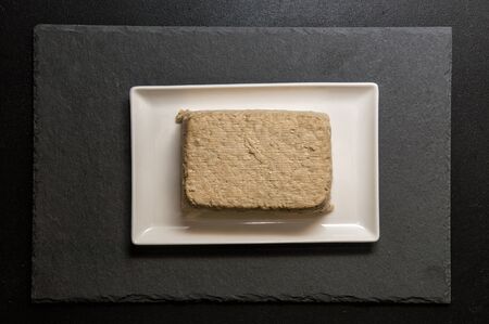 Flat lay. Close up, macro. Japanese food. A piece of tofu, a protein-rich soy cheese, on a white rectangular plate. Black background.