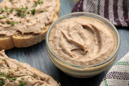 Fresh homemade chicken liver pate with herbs on bread on a blue wooden table. A sandwich. close-up