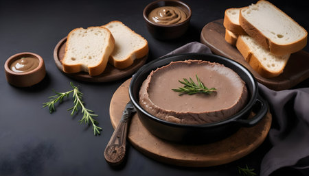mousse, pate in a jar with a baguette and parsley on a wooden background dark