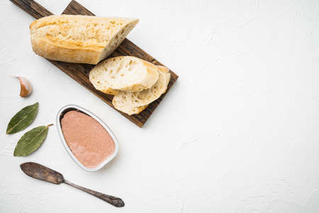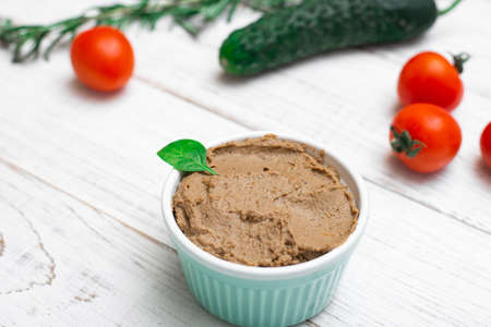 Pate. Bowl of homemade liver pate on white background, top view. Chicken liver pate with bread.