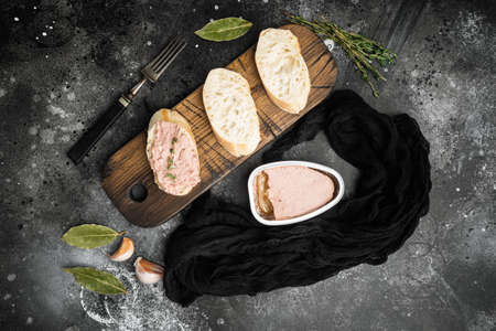 Chicken liver pate sandwich baguette set, on black dark stone table background, top view flat lay
