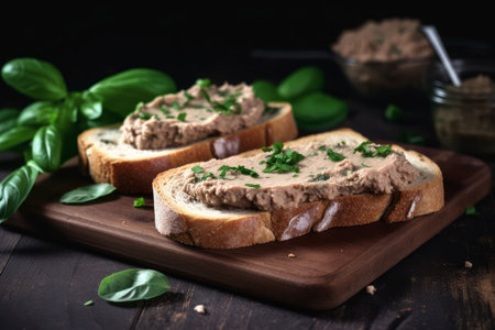 Creatively lit aerial shot of chicken liver pate on toast with parsley garnish. Copy space.