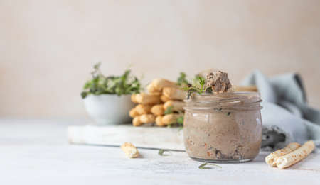 Homemade liver pate, spread or mousse in glass jar with grissini and microgreens, light concrete background.