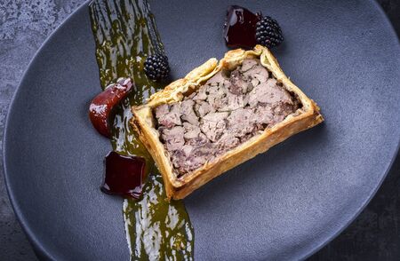 Foie gras or duck liver pate in a pastry, meat pie at a farmers market at an artisanal bakery in the historic center of Strasbourg, Alsace, France