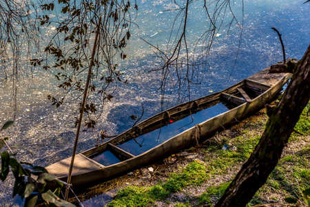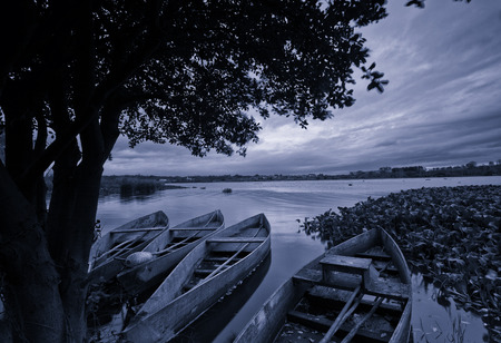 Wooden boat of fishermans in riverside and sunshine or sunset background, beautiful landscape in Thailand