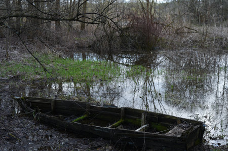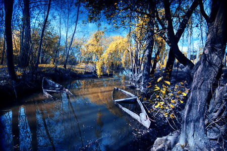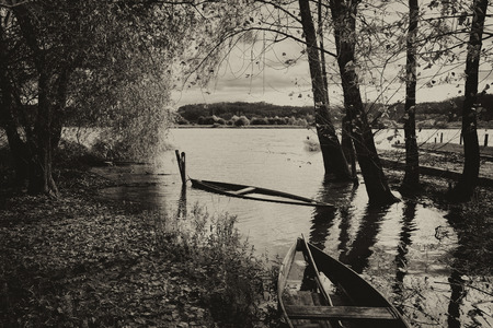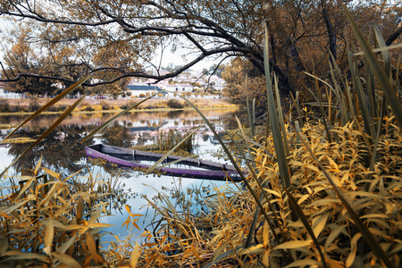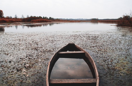 Autumn lake scenery with plenty of fallen leaves on the water and close-up of an old boat and orange and red trees on the horizon. Nature, fall, aging and sadness concept.