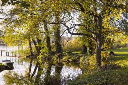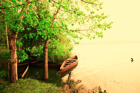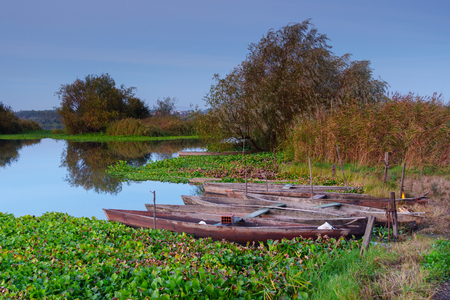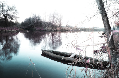 River and old wooden rowing fishing boat at beautiful sunrise in autumn morning.