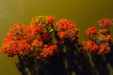 Traveller swims on stand up paddle board at lake among autumnal swamp trees. Drone view