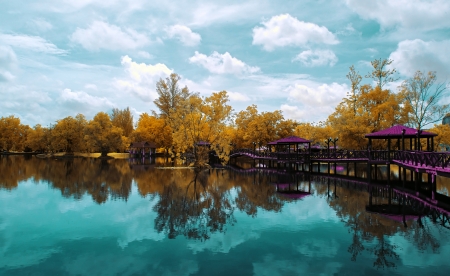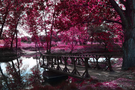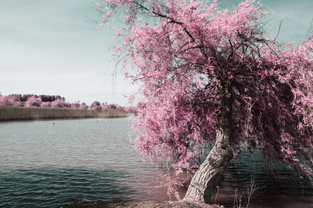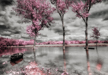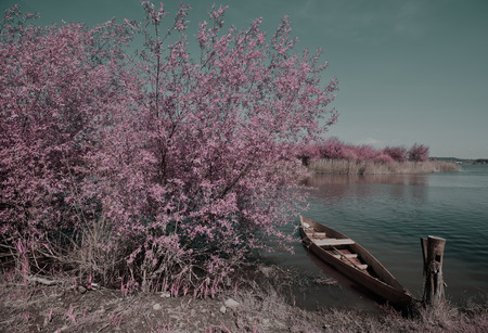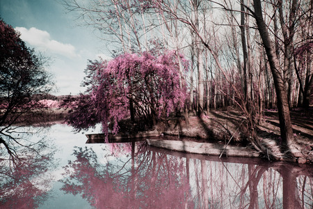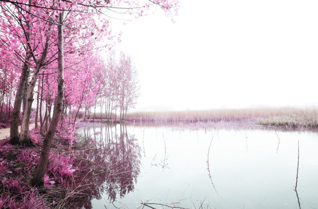 Red or pink leaves trees at a beautiful lake reflection landscape. Springtime morning