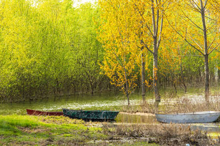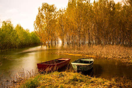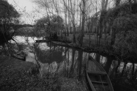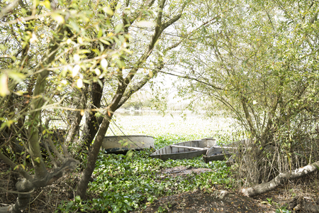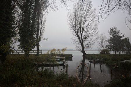 Boats shelter in a small inlet of a park in the Italian countryside on a foggy day