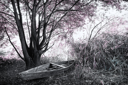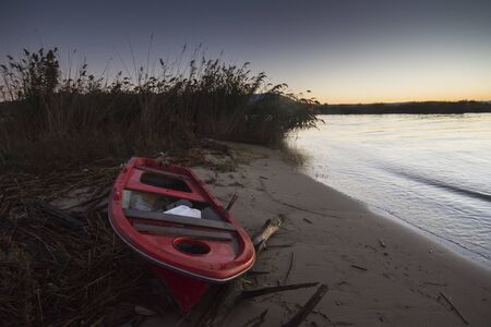 Old wooden boat on the river bank at sunset in autumn, Russia