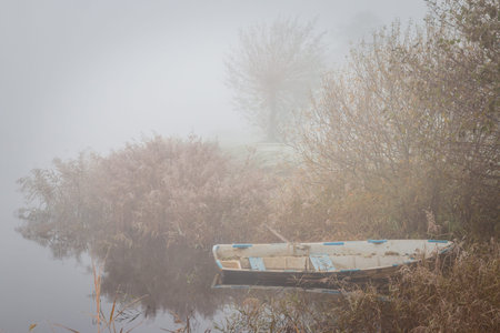 Wooden boats by reeds on shore of lake in calm misty autumn day.