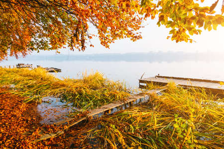Perfect morning view through the autumn forest to the lake. Location place Ternopil, Ukraine, Europe. Fresh vibrant colors. Natural wallpapers. Photo of autumn day. Discover the beauty of earth.