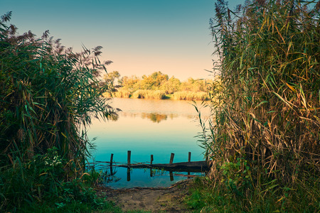 lake landscape with sunset and sky, cloud reflection in water; shoreline with fishermen's footbridge