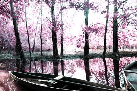 Red boat on lake with reflection trees and wild Himalayan Cherry flower blossom,