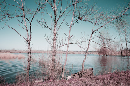 A boat travels on a deserted lake among the dry trees in the morning on a winter day