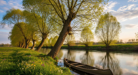 Moored boat next to a willow by the rivershore with the boat and a cloudy sky cast in the water