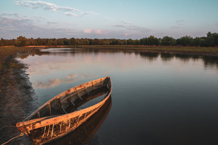 Old Wooden Rowing Fishing Boats during Beautiful Summer Sunset on river.