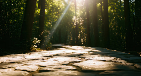 Stone pathway winding into a dense forest, illuminated by golden sun rays filtering through lush green trees. creates a serene and inviting natural scene.